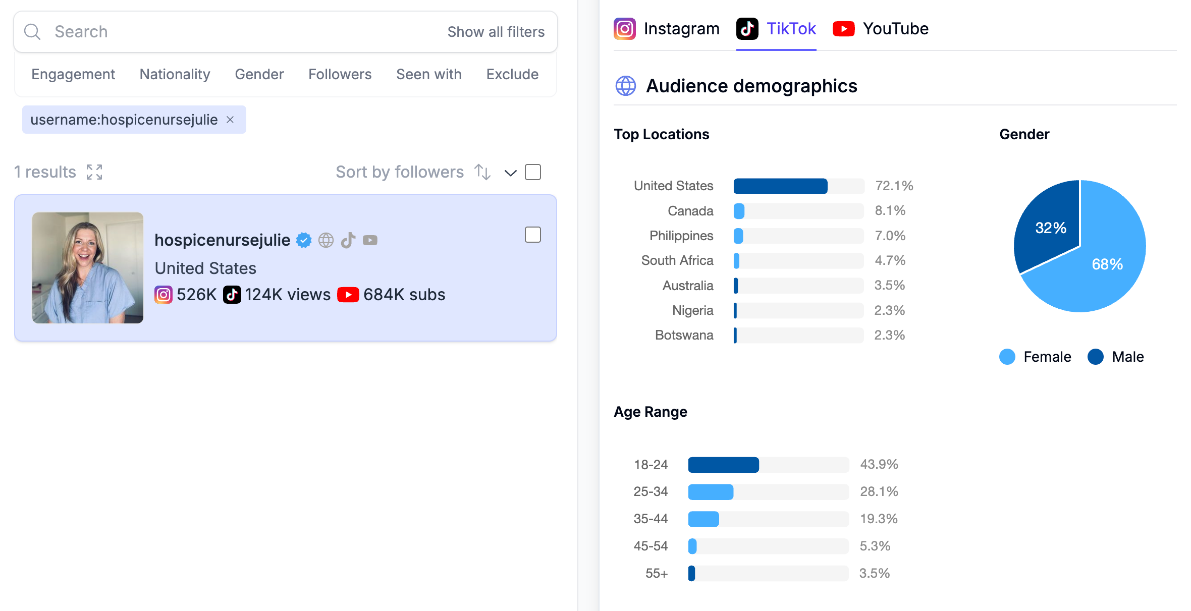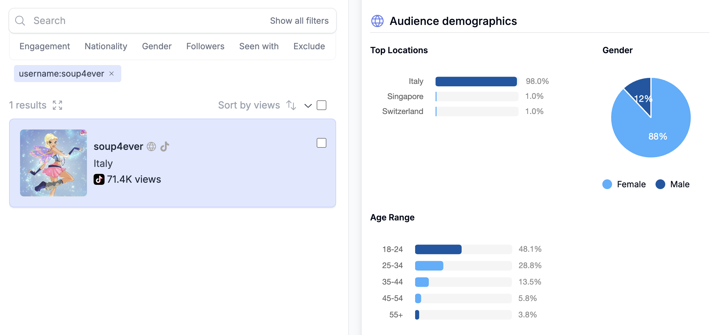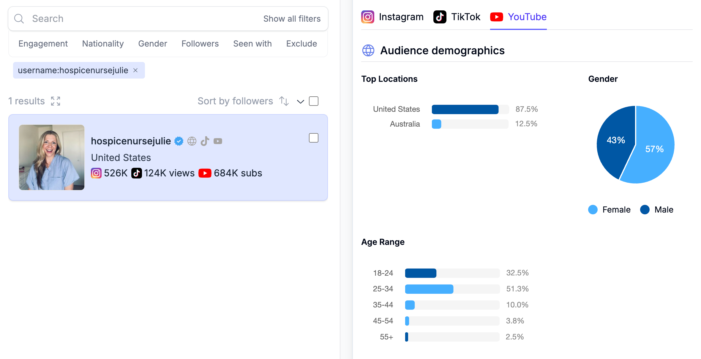 We also launched YouTube Demographics. This gives you estimated age, gender, and country data for YouTube audiences, so you can vet channels with more confidence and compare them more easily.
